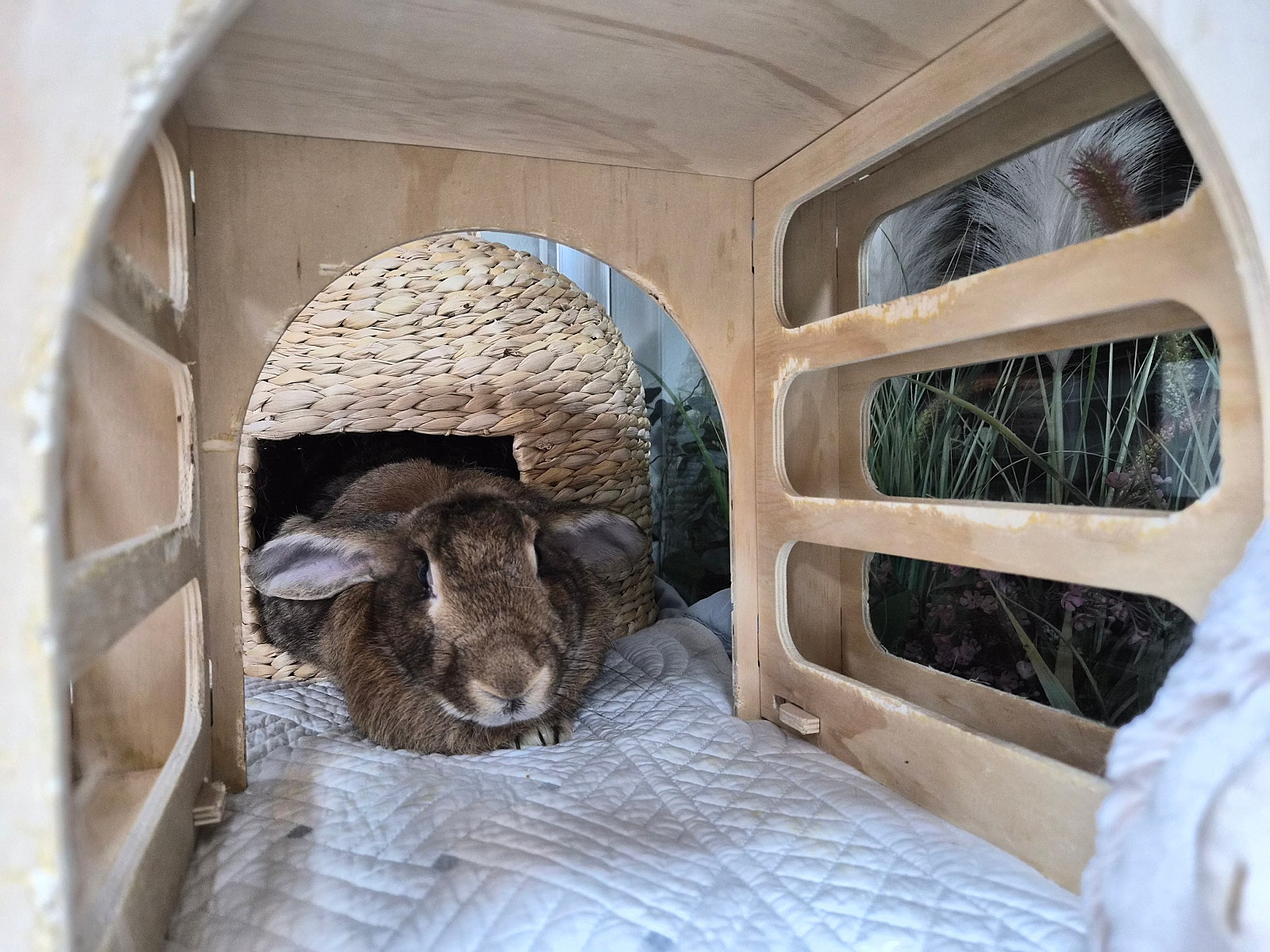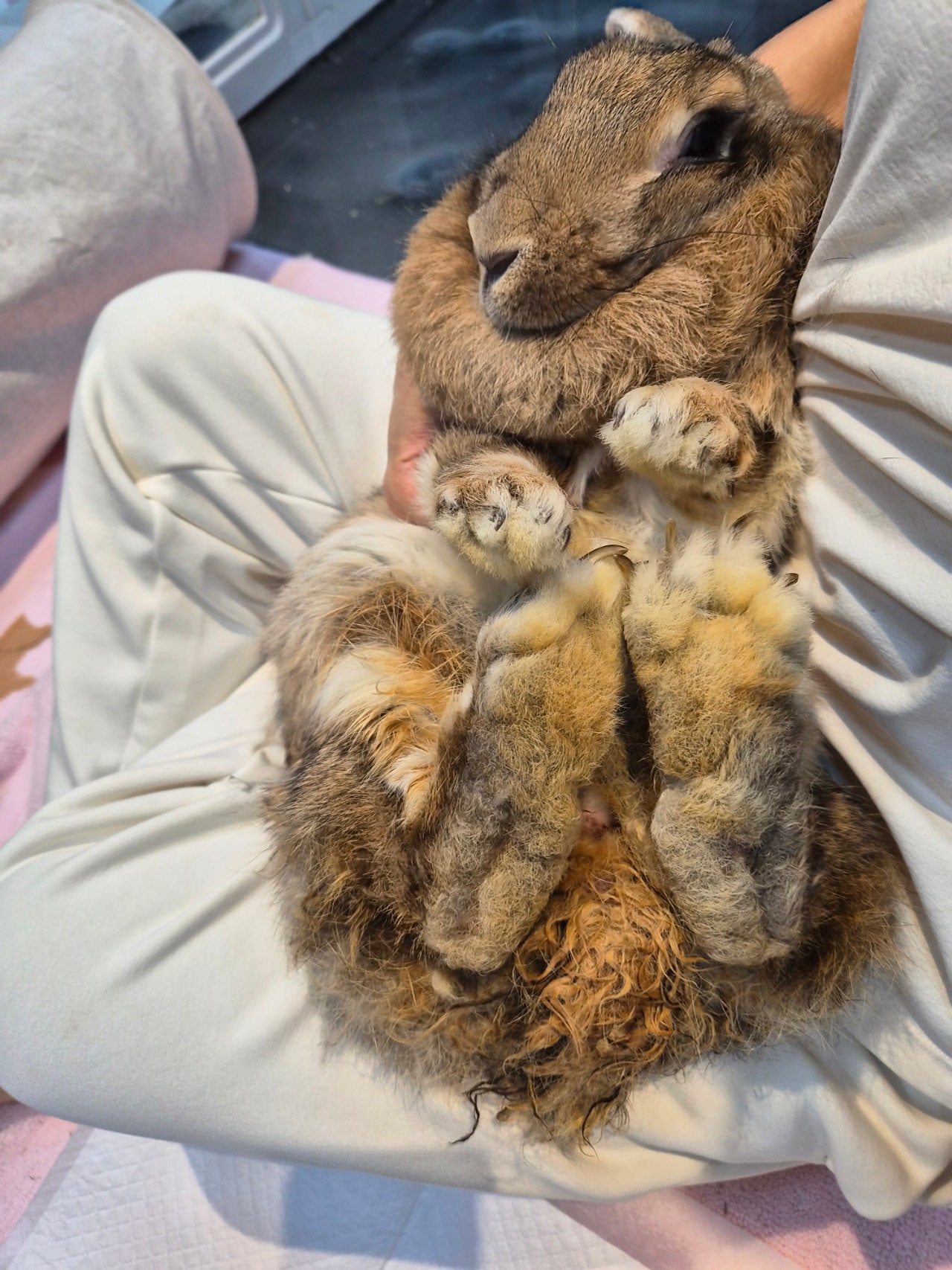 입소 배경 | 2023년 3월 옥천의 개도살장에서 최근호님이 개들을 구조한 후 도살장을 모니터링하러 들르던 중 새로 들어온 토끼를 보고 구조하여 실내 쉼터에서 돌봄시작함. 근처의 병원에는 토끼를 볼 수 있는 곳이 없어 중성화나 검진을 받은 이력 없음. 운영진의 소개로 개보호소에서 홀로 지내고 있는 건강한 4 키로 이상의 여아 토끼가 있음을 알게됨. 현재 공혈목적으로 하늘바람의집에 입소하여 지내는 톰과 제리가 각각 따로 방을 쓰고 있고, 내년이면 6세로 추정되어 안전한 공혈나이가 곧 초과될 수 있는 점을 감안하여 톰과 제리 둘 중 하나와 합사할 수 있는 조건으로 운영진 전원 입소 찬성하여 최근호님께 연락하여 입양 추진함. |