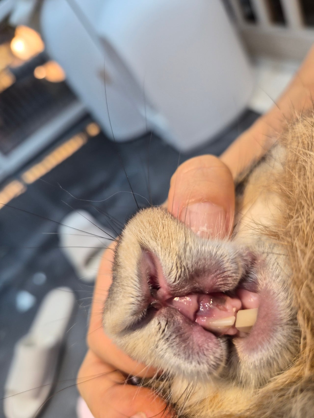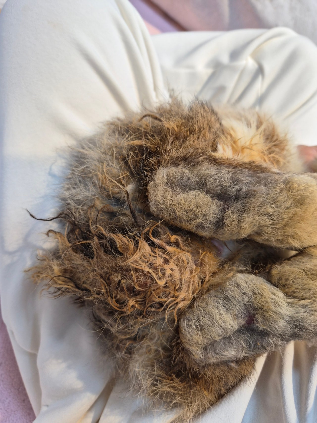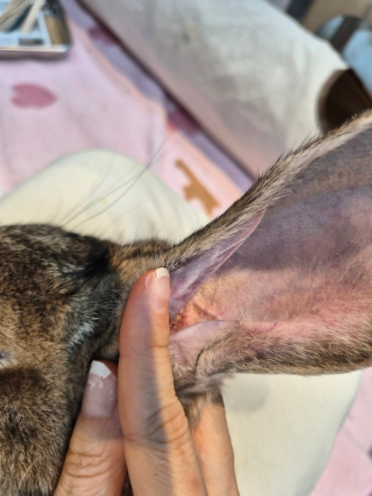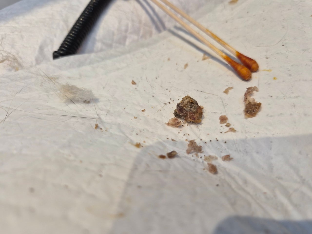 신체상태 | 눈코입, 귀, 머리: 윗니 1개 없고 부정교합. 양측 귀에 외이도염 및 진드기 -> 느슨한 덩어리 제거함, 움직이는 진드기 확인함. 외이도에 이어클리너 세척함. 몸통: 특이소견 없음 팔다리: 뒷다리 소변오염부위 피부염, 손발톱 김 -> 손발톱 클리핑함 꼬리와 항문: 꼬리 전체 소변오염으로 털이 단단히 굳은 상태 -> 클리퍼와 작은 가위를 이용하여 오염부위 털뭉침 제거함, 익일 꼬리부분만 목욕필요. |